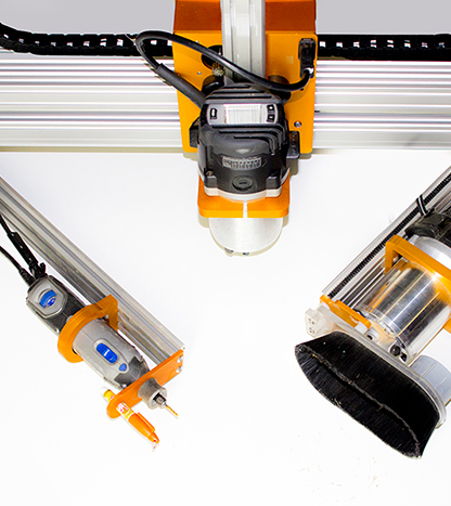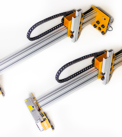 Nuestro Rail Drive viene en una variedad de longitudes que ofrecen cualquier cantidad de cambios que se puedan necesitar. Cualquier router puede estar unido al carril con poca o ninguna alteración del husillo. Cambios de herramienta se pueden hacer con sólo el cambio del eje Z. Nosotros ofrecemos un montaje universal con el hardware para aceptar una herramienta rotativa Dremel, plasma, o si lo requiere la mayoría de los marcadores tipo Sharpie.